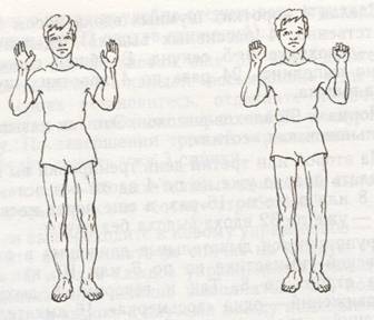 Исходное положение (и.п.): станьте прямо, согните руки в локтях (локти вниз) и "покажите ладони зрителю" - "поза экстрасенса". Делайте шумные, короткие, ритмичные вдохи носом и одновременно сжимайте ладони в кулаки (хватательные движения). Подряд сделайте 4 резких ритмичных вдоха носом (то есть "шмыгните" 4 раза). Затем руки опустите и отдохните 3- 4 секунды - пауза. Сделайте еще 4 коротких, шумных вдоха и снова пауза.
