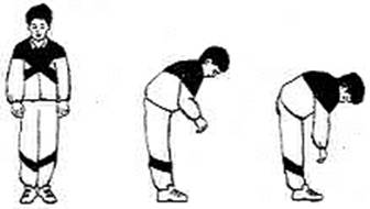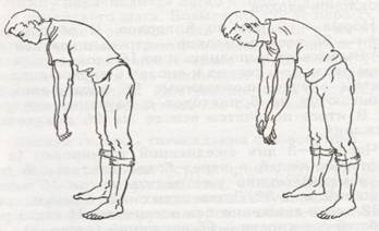 И.п.: станьте прямо, ноги чуть уже ширины плеч, руки вдоль туловища (основная стойка - о.с.). Сделайте легкий поклон (руками тянуться к полу, но не касаться его) и одновременно - шумный и короткий вдох носом во второй половине поклона. Вдох должен кончиться вместе с поклоном. Слегка приподняться (но не выпрямляться), и снова поклон и короткий, шумный вдох "с пола". Возьмите в руки свернутую газету или палочку и представьте, что накачиваете шину автомобиля. Поклоны делаются ритмично и легко, низко не кланяйтесь, достаточно поклона в пояс. Спина круглая, а не прямая, голова опущена.