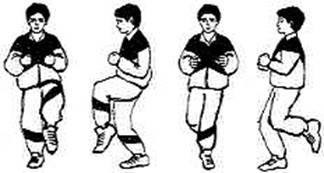 И.п.: то же. Отведите левую ногу, согнутую в колене, назад, как бы хлопая себя пяткой по ягодицам. На правой ноге в этот момент слегка присядьте и шумно "шмыгните" носом. Затем обе ноги на одно мгновенье верните в и.п. - выдох сделан. После этого отведите назад согнутую в колене правую ногу, а на левой делайте танцевальное приседание.