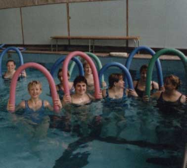 Основная часть 1. Обопритесь руками о бортик бассейна, согните ноги в коленях и подтяните к груди. Колени наклоните вправо, затем вернитесь в исходное положение. Продолжите, поворачиваясь в другую сторону. Мышцы живота должны быть втянутыми, а поясница оставаться прямой.2. Обопритесь о бортик бассейна руками, погрузитесь в воду лицом вниз. Вытяните ноги, затем медленно сгибайте колени и подтягивайте ноги к животу до тех пор, пока стопы не коснутся стены бассейна. Напрягайте брюшной пресс. Далее все движения повторите в обратном порядке. Когда ягодицы достигнут поверхности воды, закончите. Следите за тем, чтобы голова находилась на одной линии с позвоночником. Для более тренированных упражнение можно выполнять без опоры, держась на плаву, и использовать гребковые движения рук. 3. Встаньте спиной к стене бассейна, обопритесь о бортик и вытяните тело так, чтобы ноги свободно лежали на поверхности воды. Расслабьте плечи, втяните живот, напрягите пресс и подтяните ягодицы к стене бассейна. Затем примите исходное положение и снова повторите. 4. Встаньте у бортика. Поднимите ногу вперед и сделайте мах ею в сторону к поверхности воды и назад так, чтобы маховая нога скрестилась с опорной. Следите за тем, чтобы колени были направлены вперед, а бедро поднимаемой ноги не разворачивалось назад, туловище не сгибайте. Для усиления эффекта на ноги можно надеть ласты, они станут источником дополнительного сопротивления и будут тренировать мышцы ног. 5. Примите упор лежа на спине или лицом вниз, руками держитесь за бортик. Расслабьтесь и дайте ногам всплыть. Причем ноги должны подниматься до тех пор, пока вы не почувствуете неприятных ощущений. Начинайте делать ногами движение, напоминающее работу ножниц. Вначале разведите их в стороны, затем сведите. Ноги во время движения должны быть слегка согнуты в коленях, а бедра немного развернуты. Начинайте в среднем темпе, постепенно убыстряя его. 6. Встаньте у бортика и возьмитесь за него обеими руками. Согните одну ногу в колене и плавно поднимите. Сделайте мах ногой назад как можно дальше. Затем вернитесь в исходное положение. Махи нужно делать не очень резко, чтобы не растянуть мышцу. Начинайте их полусогнутой ногой, постепенно выпрямляя ее. 7. Отжимания. Упритесь в пол бассейна ногами, держась руками за поручни. Подтянитесь к поручню и оттолкнитесь от него. Проделайте 4-8 раз. Сделайте паузу. Обопритесь руками о бортик, приподнимите туловище из воды и отожмитесь (напрягите руки и выпрямите в локтях). Держа спину прямо, осторожно опуститесь в воду. 8. Вам понадобятся небольшие гантели. Выберите такую глубину, чтобы вода доходила до шеи. Встаньте прямо, ноги врозь. Руки разведите на ширину плеч. Затем, напрягая мышцы груди, сведите руки вместе перед собой и перекрестите. После чего напрягите мышцы в области лопаток, разведите руки в стороны и слегка заведите за спину. Затем вернитесь в исходное положение. Ноги держите слегка согнутыми в коленях, а руки - в локтях. 9. Встаньте в воде так, чтобы она доходила до шеи. Возьмите в руки гантели и держите их под водой на уровне груди так, чтобы локти были плотно прижаты к туловищу. Сделайте с силой движение пуками вниз, полностью выпрямив локти. После чего медленно, скользящим движением поднимите руки к поверхности воды на уровне груди. Ноги держите слегка согнутыми в колен