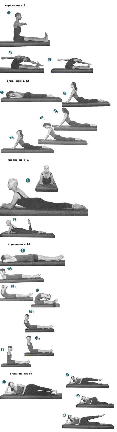 Упражнения 11-15 ![]() Упражнение 11 1. Сядьте, вытянув позвоночник, чуть шире бёдер. Вытяните руки в стороны. Втяните живот. 2. Опустите вытянутую левую руку к правой ноге. Медленно выдыхая поверните тело вправо. Напрягите позвоночник. Вытягивайте позвоночник и задержитесь в этом положении на протяжении 3-х ударов сердца. После полного выдоха вернитесь в начальное положение. 3. Повторите наклон теперь к левой стороне. Сделайте 4 раза к каждой стороне. Упражнение 12 1. Лягте на живот, ноги вместе. Руки положите на мат под плечи. 2. На вдохе поднимите голову и грудь. На выдохе постарайтесь выгнуться как можно дальше. 3а. Наклоните голову к правому плечу. Не забывайте, что плечи должны быть опущены. 3б. Затем наклоните голову вниз. 3с. Затем наклоните голову к левому плечу и снова в центр. Повторите упражнение в левую сторону. Повторите 3 раза. Упражнение 13 1. Лягте на живот, согните руки в локтях и положите их как показано на рисунке (могут быть 2 положения - руки сжаты в кулаки или пальцы распрямлены). Втяните и напрягите живот и прижмите бёдра к мату, поднимите грудь и голову. 2. Согните ногу в колене и сделайте мах голенью. Не позволяйте бёдрам оторваться от мата. Делайте упражнение на счёт 2. 3. Повторите с другой ногой. Сделайте упражнение по5 раз каждой ногой. Во время упражнения шея вытянута, не вжимайте её в плечи, живот всегда подтянут к позвоночнику. Упражнение 14 1. Лягте на спину, ноги выпрямлены и расслаблены. Разведите их на ширину бёдер. Втяните живот и положите руки за голову. 2аб. Медленно вдыхая, начинайте наклоняться к коленям. Локти разведены, живот втянут. 3. Медленно выдыхайте и сгибайтесь к ногам, крепко прижимая их к мату. Выдохните полностью и наклонитесь до конца вперёд. 4. Вдыхая, вернитесь в сидячее положение. 5аб.Медленно выдыхайте, втяните живот ,сожмите ягодицы и медленно ложитесь на мат, делая это медленно - ребро за ребром. Если вам трудно сесть, то вы можете закрепить ноги. Повторите упражнение 5 раз. Упражнение 15 1. Лягте на бок, подоприте голову рукой, ноги положите под небольшим углом к телу. Вторую руку положите перед телом для поддержки. 2. Поднимите верхнюю ногу до высоты плеча. 3. Медленно выдыхая, махните ногой вперёд насколько далеко вы можете, но не изменяя положения тела. Мах ногой не делайте быстро, примерно на 2 удара сердца. 4. Медленно выдыхая, махните ногой назад насколько далеко вы можете, но не сдвигая бёдер или грудной клетки с места . Во время упражнения нога вытянута, но не напряжена, носок ноги только слегка вытянут, мах делается свободно.Сделайте упражнение 10 раз на каждом боку. Поделитесь этой записью или добавьте в закладки |