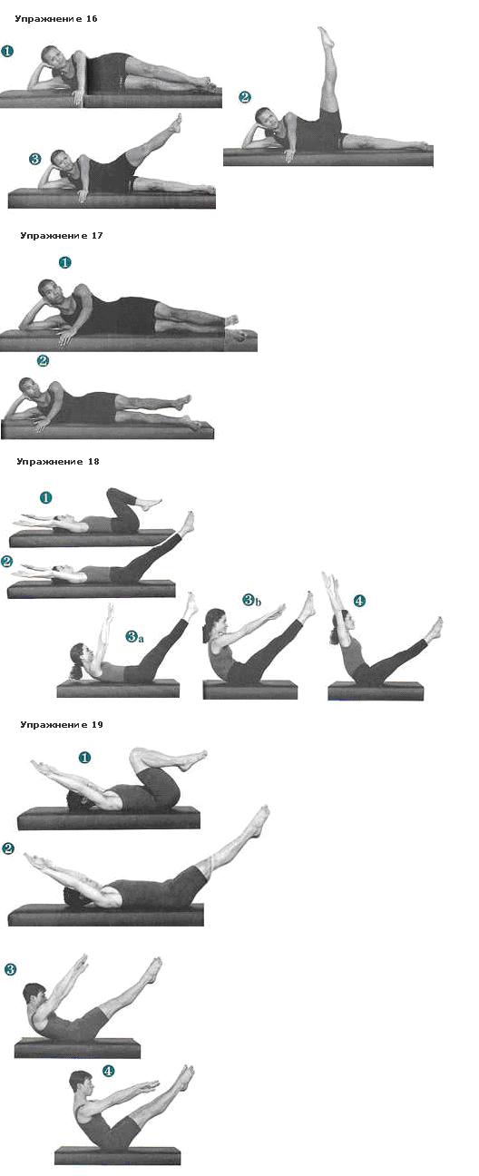 Упражнения 16-19 ![]() Упражнение 16 1. Лягте на бок, подоприте голову. Ноги положите под небольшим углом к телу. 2. Поднимите ногу перпендикулярно к полу. Вдохните. 3. Напрягая ногу опустите её вниз. Следите за положением бёдер, они должны быть неподвижными. Повторите упражнение 3-5 раз. Упражнение 17 1. Лягте на бок, подоприте голову. Ноги положите под небольшим углом к телу. 2. Поднимите верхнюю ногу на высоту пятки нижней ноги. 3. Сделайте энергично ногой маленькие круги - 5 раз в одном направлении и 5 раз в противоположном. Упражнение 18 1. Лягте на спину, ноги подтяните к груди, руки вытянуты за голову. 2. Поднимите ноги на угол 45* к мату. втяните живот. 3а.,3б. С помощью мышц живота, нижней части спины и ягодиц подтянитесь в V-положение. 4. Выдохните и медленно вернитесь в начальное положение. Упражнение 19 1. Лягте на спину, колени поджаты к груди и ваши голени параллельны полу. 2. Вытяните руки и ноги на 45* относительно пола. 3. С помощью мышц живота, нижней части спины и ягодиц подтянитесь к пальцам ног. 4. Удерживайте верхнюю часть тела неподвижной и не меняйте угол в то время , как вы поднимаете и опускаете ноги. Повторите 3-5 раз. Контролируя движения, вернитесь в начальное положение. Поделитесь этой записью или добавьте в закладки |