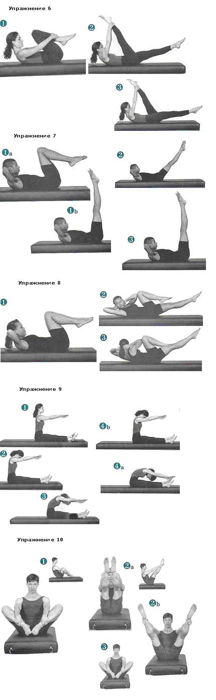 Упражнения 6-10 ![]() Упражнение 6 1. Лягте на спину и втяните живот. Оторвите плечи от мата и подтяните подбородок к груди. 2. Поднимите одну ногу и возьмитесь руками за лодыжку. Вытяните носок другой ноги и поднимите её на 5-25см от мата. Подтяните первую ногу к себе. 3. Поменяйте ноги . Сделайте упражнение 5-10 раз. Следите, чтобы нога была прямой во время упражнения. Делайте на счёт два при наклонах к голове и на счёт два при смене ноги. Не забывайте держать спину плоской. Упражнение 7 1. Лягте на спину и подтяните колени к груди, затем вытяните ноги перпедикулярно мату. Оторвите плечи и подтяните подбородок к груди., руки за голову. 2. Подтяните живот, выдыхайте и опускайте ноги одновременно, стараясь не отрывать спину от мата. 3. Во время выдоха поднимите ноги на 90* к мату. Вернитесь в начальную позицию. Повторите 5-10 раз. Не выполняйте это упражнение , если у вас боль в спине. Когда поднимаете ноги из угла в 45*, делайте это быстро, не забывая втягивать живот. Упражнение 8 1. Лягте на спину и подтяните согнутые в коленях ноги к груди. Положите руки за голову и разведите локти. Подтяните подбородок к груди. 2. Подтяните правую ногу к груди и одновременно вытяните левую. По диагонали подтяните левый локоть к правому колену. Задержитесь на несколько секунд в этом положении. 3.Поменяйте ноги. Повторите 5-10 раз. Упражнение 9 1. Сядьте с выпряленными ногами и разведите их шире плеч. 2. Вдыхая и вытягивая позвоночник вверх , начинайте сгибаться к вашим ногам. 3. Мышцы живота должны быть втянуты. Плавно сгибайтесь вперёд и выдыхайте. 4аб. На вдохе начинайте выпрямляться. Напрягите ягодицы, сядьте вытянув позвоночник вверх и выдохните. Повторите 3 раза и с каждым повторением старайтесь всё больше наклониться вперёд. После этого вернитесь в начальное положение. Упражнение 10 1. Балансируя на ваших ягодицах и взявшись руками за лодыжки(или пальцы ног), подтяните к себе согнутые ноги. 2а. Вытяните ноги вперёд. 2б. Разведите ноги шире плеч, живот втянут, вдохните. 3. Опустите ноги в начальное положение. Повторите упражнение 6 раз. Поделитесь этой записью или добавьте в закладки |