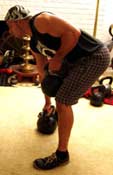 1. Встаньте около стула. Левой рукой обопритесь о сиденье стула. Следите за тем, чтобы спина была прямая. В правую руку возьмите гирю весом 24 кг. Колени должны быть слегка согнуты. Левая нога находится немного впереди. Правая рука с гирей внизу. Начинайте подтягивать гирю к груди, затем опускайте вниз.