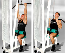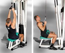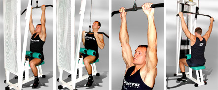 Сохранять спину прямой в поясничном отделе. Тяги сверху узким хватом