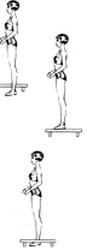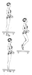 Упражнение 2 Исходное положение: встаньте правым боком к степу, ноги поставьте вместе, руки согните в локтевом суставе. Положите левую ногу на шаговую платформу, опираясь на правую ногу. Сделайте легкий прыжок и приземлитесь на левую ногу, правая при этом должна свободно опуститься на степ. Еще раз подпрыгните, поменяв ноги в первоначальное положение. Выполните 15—20 подобных прыжков. Затем расслабьте мышцы ног и встаньте к степу левым боком. Правую положите на степ и повторите упражнение, начиная прыжки с левой ноги. Упражнение 3